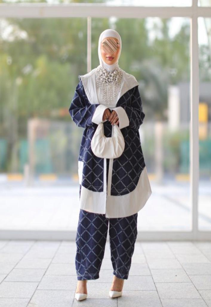 A bold and contemporary look for those who love distinction! Own this masterpiece that combines elegance and boldness. This two-piece set features a unique design that combines dark navy blue with distinctive white checkered patterns. The set features a loose blouse with an oversized collar and elegant white details that add a dramatic touch, in addition to loose pants in the same pattern. You can easily coordinate this set with attractive accessories like a large pearl necklace and a white handbag to complete your elegant look. Perfect for an unforgettable look on special occasions.