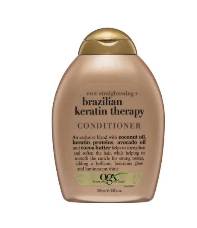 Ogx Brazilian Keratin Conditioner 385 ml is a smoothing conditioner for wavy and curly hair. Its rich formula with coconut oil, keratin, avocado oil and cocoa butter helps strengthen and soften hair, while helping to smooth the cuticle, leaving it shinier.