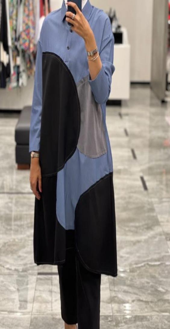 A modern look with a unique design! Add an artistic touch to your wardrobe with this long shirt with an innovative design. It features a combination of fabric in different colors, such as black and gray, with blue stripes, creating a modern artistic masterpiece. The shirt's beauty is highlighted by its visible white seams that define the cut, giving you a bold and practical look. You can easily pair it with black pants for a complete and elegant look.